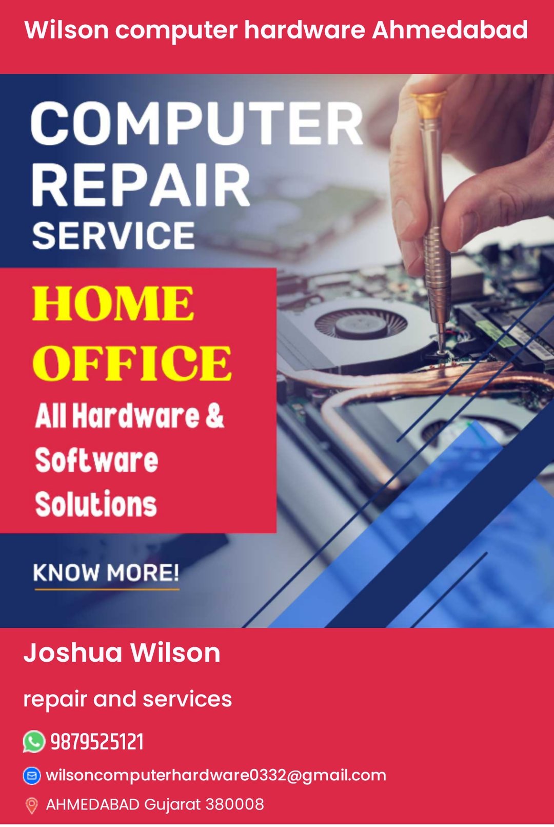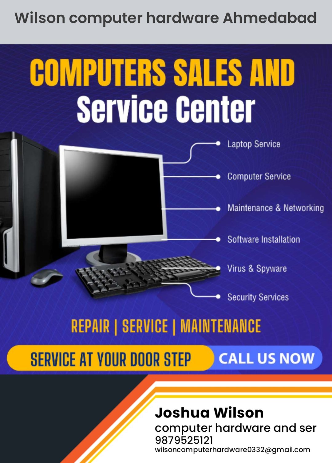 Wilson computer hardware Ahmedabad was established in 2025 with one mission: to bring a reliable, high quality Computer Repair Service to the Ahmedabad area. Our passion for excellence is what inspired us to set up shop, and continues to drive us to this day. All our repairs are completed with meticulous detail, resulting in a product that is as good as new.